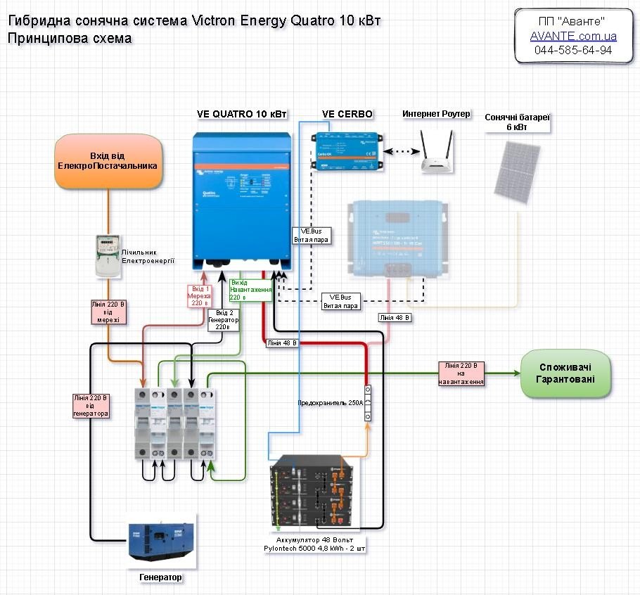 В цьому дописі ми розглянемо принципову схему підключення гібридної резервної системи Victron Energy потужністю 10 кВт з АКБ PylonTech. Ця система може використовуватися для забезпечення безперебійного живлення вашого будинку або підприємства в разі відключення електроенергії.