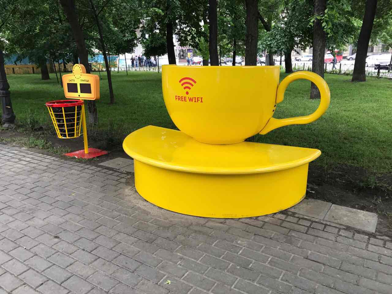 - Дизайн: Яскраво-жовті лавки у формі чашок не лише зручні, але й естетично привабливі. Вони стали справжньою окрасою скверу №2 біля Гостинного двору.