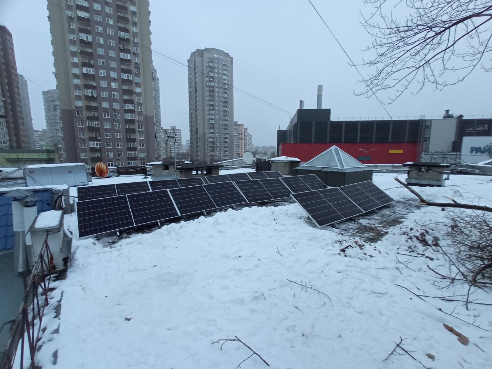Сніг — це час, коли неможливо працювати на скатних дахах, але на пласких — можна. Саме тому працюємо на енергетичну незалежність українського малого бізнесу — встановили резервна сонячну систему для приватної стоматології в Києві в грудні 2022 року.