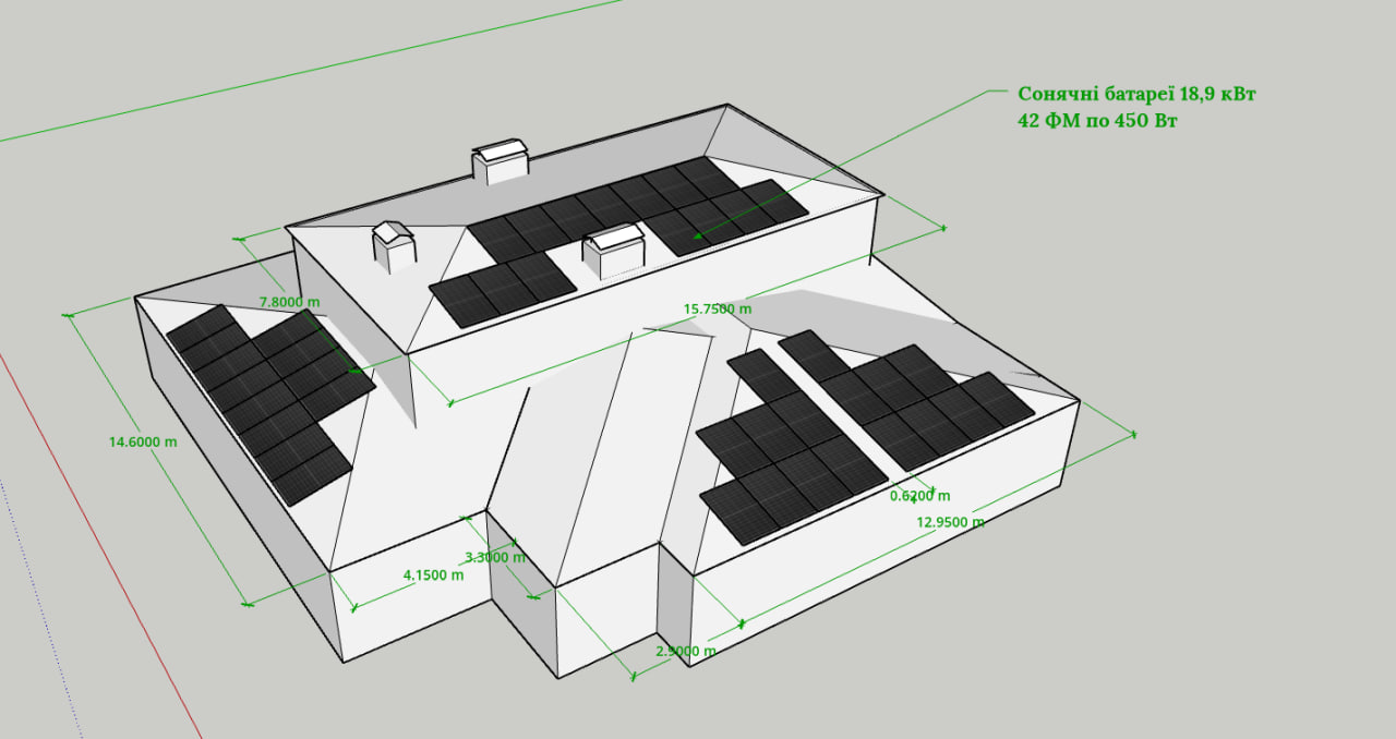 - Сонячні батареї Risen потужністю 450 Вт кожна, загальна встановлена потужність — близько 15 кВт. Панелі забезпечують ефективну генерацію енергії навіть у хмарні дні.