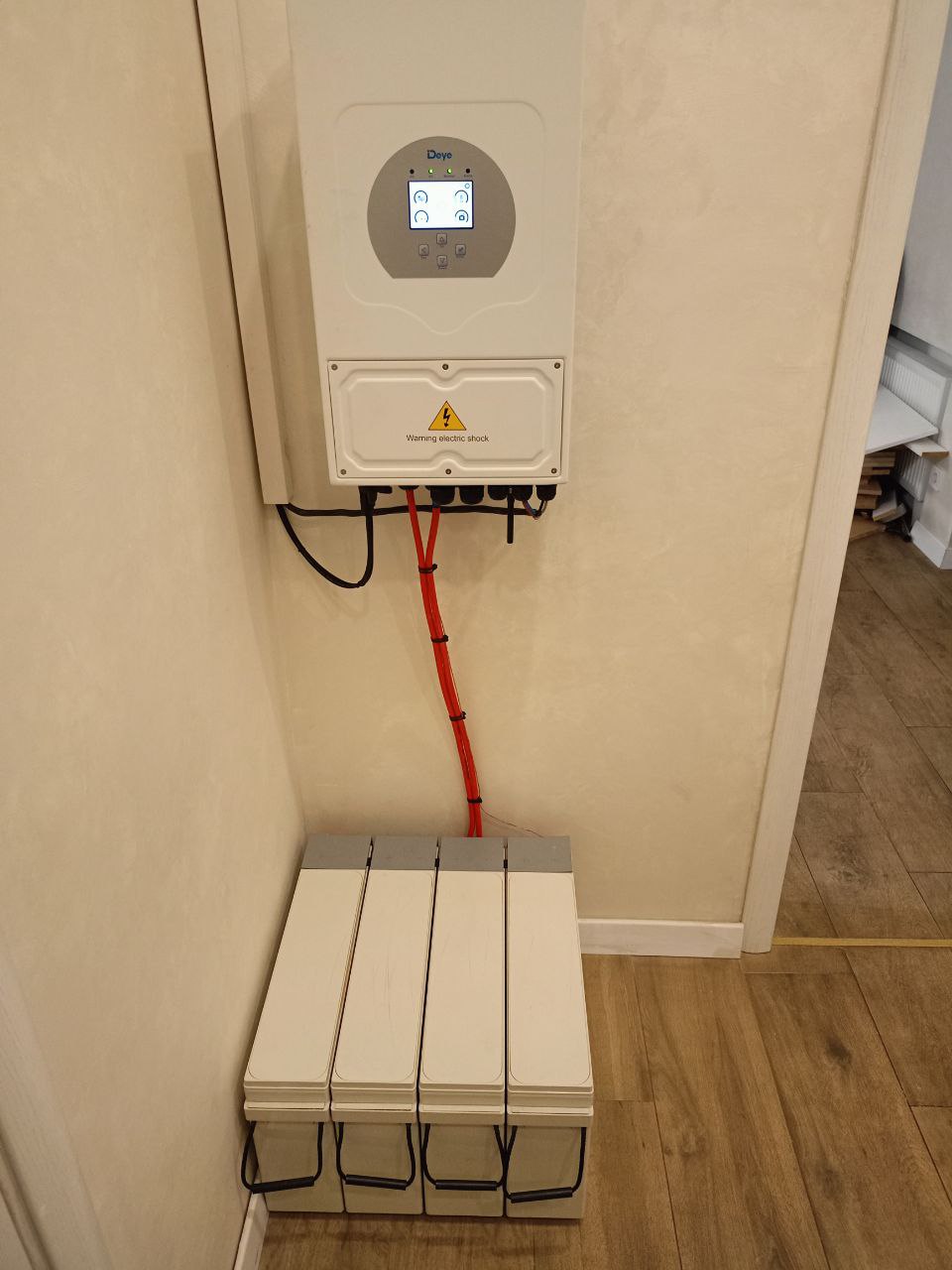 📷 На фото: встановлена гібридна система DEYE 5 кВт із сонячними батареями на даху та акумуляторними батареями в приміщенні.