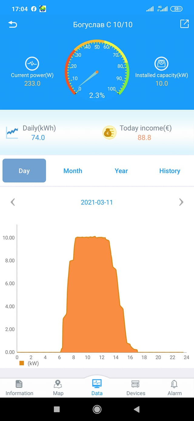 Аванте99 з радістю ділиться чудовою новиною: сонячна електростанція потужністю 10 кВт, яку ми встановили в м. Богуслав Київської області, виробила 74 кВт електроенергії за один день! Це сталося 12 березня 2021 року, в сонячний день.